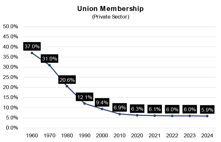 Today, just 5.9% of workers in the private sector belong to a union. Like any business, unions need a revenue stream to stay in business. This revenue comes from dues paying members. Unions need new members to survive.